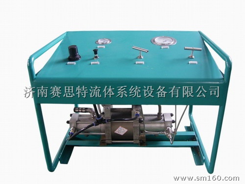 该装置是采用我公司生产的增压比为 40:1的气体增压泵,其动力来源是空压机的0.3-0.8MPa的压缩空气,额定输出压力为12-32MPa。装置上配有手动调压阀,通过调整增压泵的驱动压力即可无级调整增压泵的输出高压气体的压力,出口接有3米的高压测压软管,用户只需准备一排量在0.5-0.75m3/min的空压机,通上气管就可进行CNG汽车改装管路的气密性检测。成套装置成功用于济南公交、淄博公交、东风汽车、海马汽车、东南汽车、宇通客车、川汽、金龙客车等和全国各地区的天然气汽车改装厂的气密性检测。