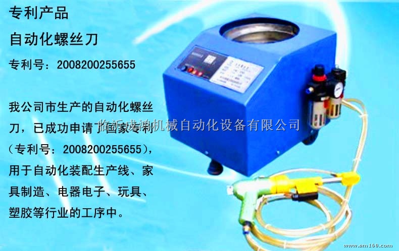 本公司最新研制生产的自动螺丝刀,已批准为国家专利(专利号:ZL:200820025565.5),该产品主要用于散装螺丝,该设备设计新颖、制造精良、具有体积小、重量轻、操作简单、性能稳定、安全低噪音等优点,可广泛用于自动化装配生产线、电子电器、铝合金门窗制造、家具制造、玩具等行业的装配工序中。该设备完全省略了对螺钉的手工“抓取, 移动和定位”动作该设备可以准确地自动连续向螺丝刀头供给螺丝,并予以精确定位,在组装过程中,使得对准工件与拧紧螺丝的动作合而为一,以经济低廉的初期投资(相对于全自动拧紧工作站)赢得高效的生产,是您们提高工作效率最理想的气动工具,欢迎海内外客商来电来函洽谈业务