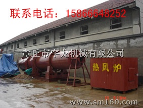 燃烧木柴、煤炭的燃烧炉产生的高温燃气首先进入净化室,烟尘、火花产生沉降并配入部分冷风至400℃以下,然后进入滚筒烘干物料,为降低出口物料温度,物料与热风并流。