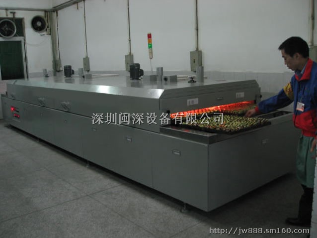 (3)电器部分:电源380V,25A,三相五线制,功率 18KW,采用台湾2P爱得利变频器变频调速2.2KW,传动速度0.1-8米/分钟任意可调;采用日本RKC温控器,温度室温至200℃任意可调,功能有PID自整、自动恒温、双温控器控制,具有超温断电报警、漏电保护等功能,内部温差±3度;其它控制电路电器均采用国内正牌电器控制;每段炉腔各配运风马达一台配十寸运风风轮,装24条红外线陶瓷(石英)发热管,每条600W均匀分布在炉腔内部分2段4路控制(温度到后可任意关掉任何一组,达到省电的目的)每段炉内温度可单独控制,方便设置每段不同温度。