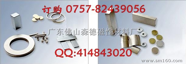 广东佛山森德磁性材料厂主导产品为钕铁硼强力磁铁、磁钢磁铁、铁氧体磁铁,和橡胶磁铁,黑色磁普通磁铁.质量稳定,交货及时,价格优惠。可生产玩具、工艺品、电机、门吸、包装用钕铁硼磁铁和磁保健等厂家用的圆柱、圆环、方块、瓦形等各种规格的磁铁|如¢3×3mm、¢4×2 mm、¢4×4mm、¢5×5mm、¢6×2mm、¢6×3mm、¢6×4mm、¢8×2mm、¢15×2 mm、¢13×¢5.5×1mm等¢3至¢200mm直径的磁性材料。方块所有规格都有做(特殊规格极具优势)我厂可以按照客户需求生产不同规格的磁铁。广东省内免费送货上门!!!