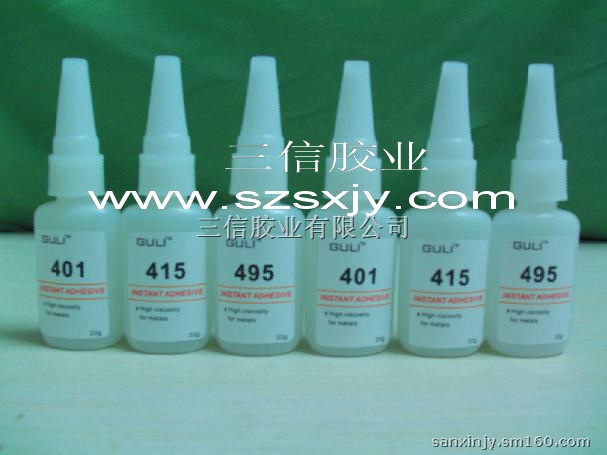 深圳市三信胶业有限公司产销的400快干胶系列。低白化,高强度。通用及常用型其对于金属、塑胶、橡胶以及惰性材料与常规材料粘接。460其粘度适中,决定其渗透性;可达缝隙深处,起到快速固定和粘接作用,其成分:a -氰基丙烯酸甲氧基乙酯Methoxyethtl cyanoacrylate Adhesive低白化,低气味,单组份,中速固化,粘接材料广泛,适用于P+R.....电器、仪表、机械、电子、光仪等行业适用。401,415,495,495胶水,406胶水