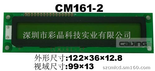 产品型号:CM161-2 产品品牌:Cm 产品描述: 显示内容(字数*行):16*1 外形尺寸/mm(L*W*H):122*33*12.3 视域尺寸/mm:99*14 点数/mm:5*8 点尺寸/mm:0.92*1.1 控制器/备注:ks0066 联系人:黄先生 MSN:h_lmf888@hotmail.com QQ:634918249 TEL:0755-81829060 E-mail:szcm_lcd@yahoo.com.cn