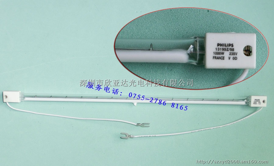 飞利浦13195Z/98 1000W红外线灯管 双端石英红外线灯是一种高效的加热源。 优点:效率高,热传递快,对控制装置反应灵敏,结构紧凑,重量轻。 用途:加热或者收缩化学反应,附生反应木材和纸张的干燥油漆和印刷油墨的干燥加热消毒吹制PETP瓶子食品的加热和保温。 PHILIPS 型号 | 电压 (V) | 功率 (W) | 灯管总长 (mm) | 色温 (K) | 灯头 | 有效寿命 (h) | 13908R | 230 | 300 | 117.5 | 2500 | R7S | 1000 | 13908Z | 230 | 300 | 112.0 | 2500 | SK15 | 1000 | 13169X | 120 | 500 | 242.0 | 2500 | X | 5000 | 13169X/98 | 120 | 500 | 242.0 | 2500 | X | 5000 | 500T3 | 120 | 500 | 224.0 | 2500 | U | 5000 | 13169Z/98 | 235 | 500 | 227.0 | 2400 | SK15 | 5000 | 13169R | 235 | 500 | 220.6 | 2400 | R7S | 5000 | 13790R | 220 | 650 | 550.4 | 2200 | R7S | 5000 | 13842Z/98 | 235 | 700 | 216.0 | 2600 | SK15 | 5000 | 13842Z | 240 | 700 | 216.0 | 2600 | SK15 | 5000 | 800T3 | 120 | 800 | 303.0 | 2500 | U | 5000 | 13195X/98 | 235 | 1000 | 370.0 | 2450 | X | 5000 | 13713X | 235 | 1000 | 370.0 | 2450 | X | 5000 | 13713Z/98 | 235 | 1000 | 355.0 | 2400 | SK15 | 5000 | 13195Z/98 | 235 | 1000 | 355.0 | 2400 | SK15 | 5000 | 13713X/98 | 235 | 1000 | 370.0 | 2450 | X | 5000 | 13402Z | 235 | 1000 | 355.0 | 2500 | SK15 | 5000 | 1000T3 | 240 | 1000 | 351.0 | 2500 | U | 5000 | 100T3/CL | 240 | 1000 | 303.0 | 2500 | U | 5000 | 13561Y/98 | 144 | 1200 | 221.0 | 2400 | Y | 5000 | 14134Z/98 | 235 | 1200 | 228.0 | 2700 | SK15 | 5000 | 13935R | 230 | 1530 | 447.9 | 2400 | R7S | 5000 | 13568Y/98 | 144 | 1600 | 221.5 | 2500 | Y | 5000 | 13568Z/98 | 144 | 1600 | 22980 | 2500 | SK15 | 5000 | 1600T3 | 208 | 1600 | 503.0 | 2500 | U | 5000 | 14135Z/98 | 235 | 1600 | 228.0 | 2600 | SK15 | 5000 | 1600T3 | 240 | 1600 | 503.0 | 2500 | U | 5000 | 1600T3/7 | 240 | 1600 | 498.5 | 2550 | R7S | 5000 | 13938R | 230 | 2000 | 550.4 | 2500 | R7S | 5000 | 13214Z/98 | 230 | 2000 | 657.0 | 2500 | SK15 | 5000 | 13168V | 235 | 2000 | 350.0 | 2500 | V | 5000 | 13168X | 235 | 2000 | 370.0 | 2500 | X | 5000 | 13168Z/98 | 235 | 2000 | 355.0 | 2500 | SK15 | 5000 | 13213Z/98F | 235 | 2000 | 355.0 | 2500 | Z | 5000 | 14103Z/98 | 235 | 2000 | 355.0 | 2500 | SK15 | 5000 | 2MT3/ICL/HT/UBO | 240 | 2000 | 303.0 | 2500 | U | 5000 | 13245X/98 | 400 | 2000 | 512.0 | 2500 | X | 5000 | 13245X | 400 | 2000 | 512.0 | 2500 | X | 5000 | 13765X | 400 | 2000 | 512.0 | 2500 | X | 5000 | 13765X98 | 400 | 2000 | 512.0 | 2500 | X | 5000 | 2500T3 | 480 | 2500 | 731.0 | 2550 | U | 5000 | 2500T3/CL | 480 | 2500 | 731.0 | 2550 | U | 5000 | 14107Z/98 | 230 | 3000 | 787.0 | 2400 | SK15 | 5000 | 14107Z | 230 | 3000 | 787.0 | 2400 | SK15 | 5000 | 13565X | 235 | 3000 | 370.0 | 2500 | X | 5000 | 13565V | 235 | 3000 | 350.0 | 2500 | V | 5000 | 14121Z/98 | 235 | 3000 | 355.0 | 2650 | Z | 5000 | 13230X | 400 | 3000 | 802.0 | 2500 | X | 5000 | 13230X/98 | 400 | 3000 | 802.0 | 2500 | X | 5000 |