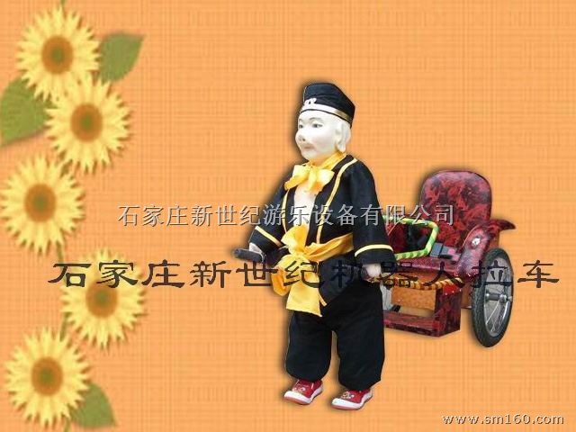 机器人拉车是一种可供人乘坐的可行走的游乐设备,给机器人穿上漂亮的衣服,并用蓄电池作能源,对机器人充一次电可连续行走3个小时以上,机器人的行走方式和外表形状和真人一样,机器人的造型有猪八戒,维尼熊,灰太狼,喜羊羊等,根据型号不同,载重在25---150公斤之间。机器人的行走安放一种电动机械装置作为行走装置,采用两套不规则四边形曲柄连杆机构,分为大型、中型和小型机器人。其行走方向可由乘车人随意控制,前进后退,左转右转灵活自如,能爬陡坡。该设施具有新颖性和独特性,同时也包括了相当的科技含量,此产品具有如此的特性,可为有创业精神之士,下岗、待业的朋友创造轻松的就业机会再就业以及投资小想自创业的人士提供很好的机会和机遇。