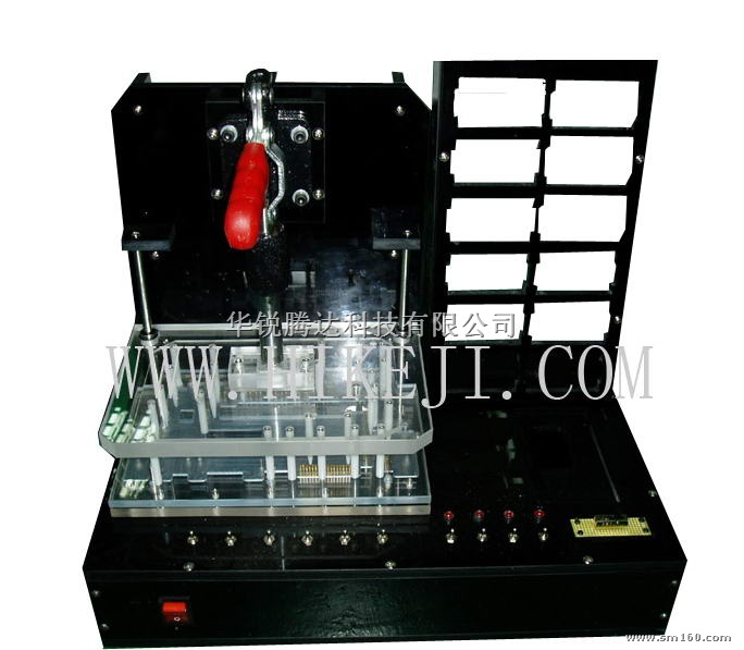 ● 采用快速夹手机械下压,操作方便;● 结构材料可根据需要采用进口压克力、电木板、玻纤板等;● 可双面植针,上下模使用进口直线轴承定位,定位精确、耐用;● 可将各种产品附件放置于治具内部,外表整齐,方便置放于生产线上,底部可掀开,便于维护;● 广泛应用于MP3、MP4、数码相框、IC芯片测试、BGA、银行KEY等产品,及板幅较小的板卡;