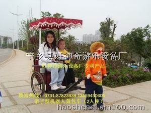 机器人黄包车,是一种可供人乘坐的游乐设备,是世界独创的专利新产品,分大、中、小三种型号和扶手控制、操纵杆控制和无线电遥控三个品种。该产品由宁乡县好神奇游乐设备厂独家生产。机器人的外表形状和行走方式酷似真人,用蓄电池作能源,充一次可连续行走3个小时以上,或行程10公里,时速达3公里;大型机器人自重12公斤,黄包车自重18公斤,载重可达100公斤。机器人的行走方向可通过无线电遥控或由乘车人利用操纵杆随意控制,前进后退,左转右转灵活自如。由于该发明创造成果具有新颖性和趣味性,同时也具有一定的科技含量,曾引起媒体的注意,湖南卫视〈晚间〉节目和长沙电视台〈新闻频道〉《生活频道》都对发明人梁晖及其发明成果进行了报道。电视节目播出后,全国各地有很多游乐业界老板和下岗失业人员纷纷来电来访要求购买机器人黄包车。为了对求购者负责,发明人并没有立即生产销售该产品,而是先用样机在宁乡县城的商业步行街用出租的方式(坐一次5分钟收费2元)对该车进行长时间的技术可行性和商业可行性实验。经过从2004年10月至2006年4月长达一 年半的实用试验,坐过大、中、小型机器人黄包车的人数以千计,其中年龄从6个月到72岁,体重最重的达到了200斤。通过实用检验,发现了技术设计上的一些不足并加以了改进,也证明了商业上确实是可行的。可喜的是:1.该车车速适宜,冲击力小,容易驾驶,始终不存在安全问题。2.在长达一 年多的实用试验时间里,尽管县城流动人口少,坐车的大都是回头客,但小朋友乃至成年人对机器人黄包车的热情始终不减,每次出租都有收获,只要坚持出租,热情服务,即使按2元/5分钟的低标准收费,一台车月收入一千元也是不成问题的。3、凡是到过宁乡商业步行街的人,可能不记得步行街的商店和商品,但没有不记得机器人黄包车的,机器人黄包车始终是步行街的一 道靓丽风景。事实证明:机器人黄包车行走速度适宜,驾御性能好、安全性能佳、适应年龄段大,用于出租灵活机动,是下岗失业人员和游乐行业人士投资小、回报快、无风险的生财工具(一个月左右可收回投资),也是长者馈送小朋友的极具品味的好礼品。