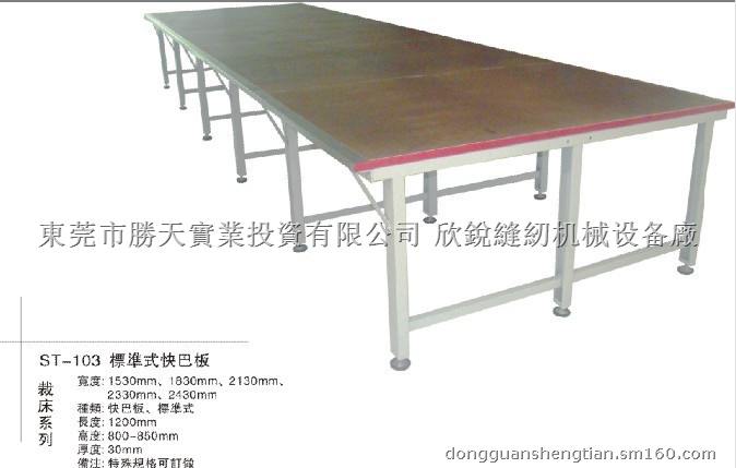 欣锐缝纫机械设备厂专业制造:气浮式,标准式美耐板裁床,普通式快巴板裁床,台板 裁剪台 拉布台铺布台 松布架,裁片架,辅料架,货架,中转架,放纸样架,查衣台,工作台,工作椅及各种特殊规格订做。裁床规格有 长:1200mm 宽:1530、1830、2130、2330、2430、2590、3030、3330mm等等, 板厚:28mm-30mm 高度:800mm-860mm欢迎致电咨询及了解。18025125728夏先生
