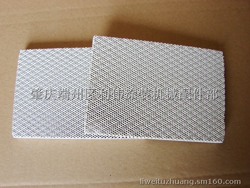 适用于燃气式红外燃烧器。此种陶瓷片通过将蜂窝陶瓷板表面由简单的平面式改进成波纹交错的立体型,增大表面积和燃烧工作面积,从而起到更好的蓄热助燃作用,克服了平面式在燃气燃烧时火焰过长、燃烧不够充分,而导致能耗高、排放不够低的不足。