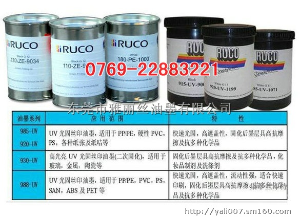 德国迪高油墨RUCO--东莞市雅丽丝油墨有限公司代理商 10KK系列:双组份丝印油墨光泽度高,适用于印刷经预处理聚烯烃(聚乙烯、聚丙烯)、聚酰胺、聚碳酸酯、热固塑料、玻璃、金属、木材、陶瓷及其它硬质材料。这些自然干化、活性固化的油墨具备流畅通顺、良好耐久的柔韧性和表面干固/完全干固迅速等主要特性。10 KK系列油墨耐油脂、酒精、湿润剂、酸、弱碱和大多数溶剂,但对含有苯酚的填充品不具抵抗作用。 |