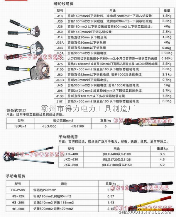 本产专业生产各种电力施工工具主要产品有:断线剪,断线钳,电缆剪,线缆剪,齿轮式断线钳,齿轮式断线剪,链条式断线剪,液压断线剪,电缆切刀,电缆主绝缘层剥除器,不可剥离外半导体成剥除器,机械冲孔机,铝合金卡线器,万能卡线器,单桃卡线器,双桃卡线器等。