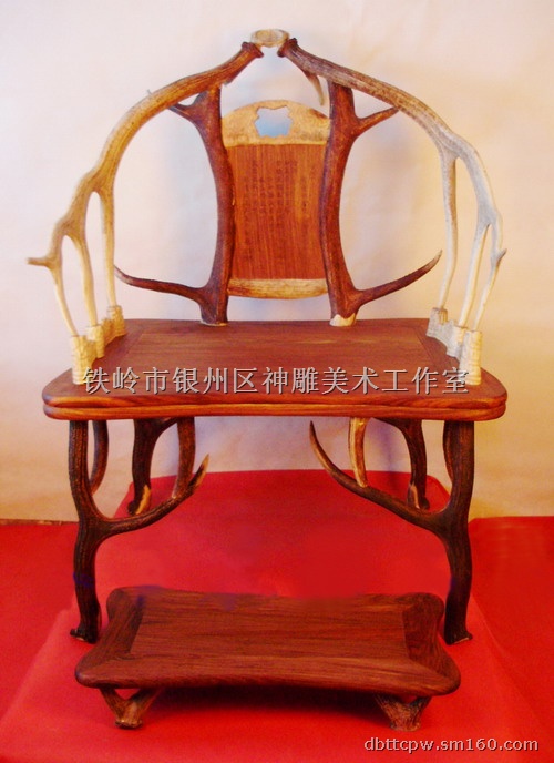 从顺治入关到嘉庆.除雍正外,四个皇帝都坐过一种特殊的椅子----鹿角椅 椅子四条腿由四枝鹿角制成.角跟部做足以坚硬的部位和自然形态与椅足正相吻合.可谓奇思妙想.前后两面椅腿向里一侧各有一叉构成支撑坐面的托角.靠背扶手也是由鹿角制成.两角的根部连在鹿的头盖骨上.椅背俩竖角间有一红木板上刻乾隆题诗.另外还有俩对小鹿角做脚踏一只.
