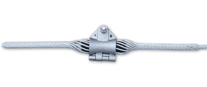 机械悬垂线夹用途:短跨距悬垂线夹是悬垂线夹的一种,介于切线线夹与预绞丝悬垂线夹之间。适用线路档距在100~200米之间,线路转角为15o以下的直线杆塔。金具的破断强度≥40KN。特点:它具有切线线夹便捷的特点,由于增加了预绞丝加强层,同时也增强了光缆一定的抗动态荷载能力。组成:机械悬垂线夹由加强层预绞丝、橡胶插件、壳体、U形环等组成。