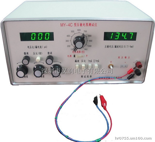 | 该仪器能测量1000V以下1mA和0.1mA的压敏电压值,能测量83%V1mA电压值下的漏电流,并能测量V1mA 0.1mA压比值。采用二组3位半数字显示面板,使读数更加准确方便。 主要技术参数 1、 恒流源 a、1mA 0.1mA 二档; b、精度:1mA±0.005mA 2、 测压敏电压 a、 范围:0-1000V,分十档; b、 能测 1mA,0.1mA 二种电流下的压敏电压; c、 精度:±(0.5%读数+1个字) 3、测漏电流: a、 输出电压可调范围:5-850V b、 出电压精度:±(0.5%读数+1个字) c、 电流表精度:±(0.5%读数+1个字)(满档199.9uA) 4测电压比: d、 V1mA 0.1mA≤1.1999 e、 范围:30V-1000V f、 精度:读数±0.002
