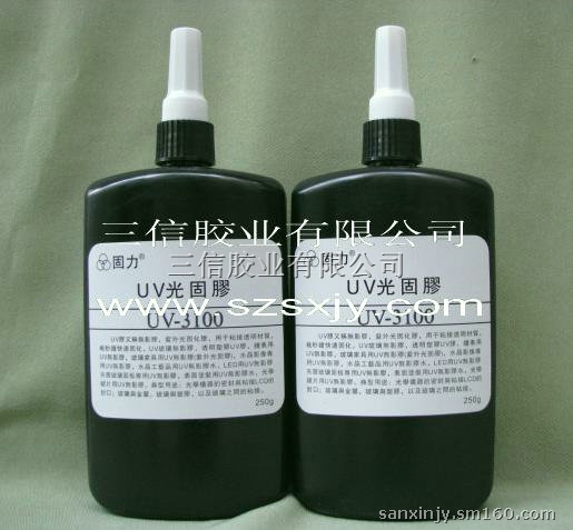 深圳市三信胶业有限公司生产销售的“固力”3000系列紫外线胶水。主要用于粘接,灌封和固定其是一款不含溶剂的胶粘剂,在紫外线照射下数秒钟内固化.UV3000系列对于水晶影象、玻璃家具,水晶工艺品,玻璃工艺品,光纤通信,透镜装配、表业等玻璃(水晶)制品间的粘接或明材料之间的粘接或玻璃(水晶)制品的组合粘接,其粘接强度均大于玻璃(水晶)本体强度。具有耐黄变、高韧性、耐冷热冲击等性质。 未尽事项需垂询时,请致电本公司业务部