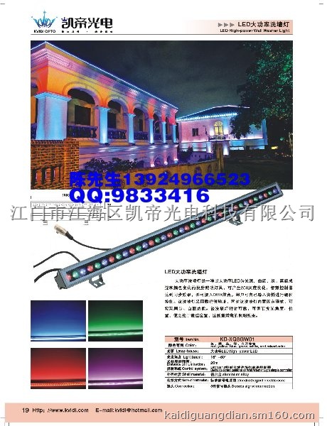 LED大功率洗墙灯是一种新兴的装饰类照明灯饰,它的特点是紧贴墙面以几乎与其平行的极小角度洗照墙面,用极其丰富多变的色彩演义一种光的境界,烘托出梦幻般氛围。主要应用于高档写字楼外墙、宾馆酒店门面装潢、各种桥梁侧壁、各种广告牌、客房内装修暗槽等。