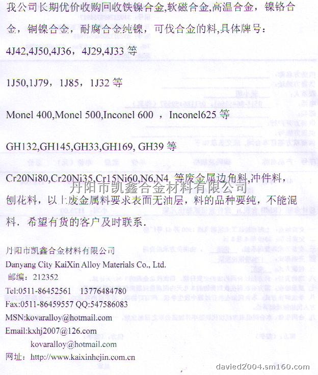 高价回收铁镍合金,软磁合金,高温合金,镍铬合金,纯镍,可伐合金的废料,具体牌号::Cr20Ni80,Cr20Ni35,Cr15Ni60,GH33,GH39,N6,N4,4J42,4J29,4J36,4J50,1J50等边角料刨花,以上废金属料要求表面无油层,料的品种要纯,不能混料.希望有货的客户及时联系.?xml:namespace>