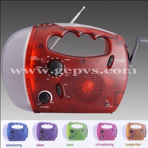 手摇发电,太阳能充电,内置充电电池,并且带有DC插口.有报警器功能,