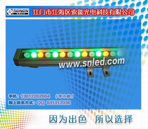 索能光电LED洗墙灯,LED大功率洗墙灯外壳采用铝合金灯体和整体模压加工工艺,确保了良好的散热效果,有效的减少了LED使用过程中的光衰。采用光学级PMMA高效透镜,光损小,照度好。独特的开关恒流源技术,确保了每颗LED稳定工作。
