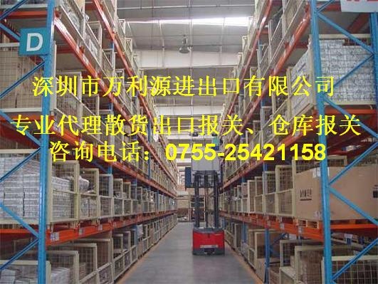 深圳万利源进出口公司长年为国内生产厂家或贸易商代理散货进仓库报关有: 笋岗外运仓库、笋岗梅园仓库、清水河胡北仓/金运达仓、关澜和记仓储、梅林华南国际物流中心/八达仓库、盐田马士基2号仓库、盐田马士基A、B、C、D、E仓库、盐田南半岛仓库、盐田港集团仓库、盐田裕泰仓库、盐田棋洋仓库、盐田怡合仓库、盐田文辉仓库、盐田群辉仓库、盐田华南物流通仓库、盐田飞驰仓库(USP)、盐田天鹰仓库、盐田中信仓库、盐田太谷仓库、盐田嘉里仓库(力又仓、中联仓、保马开仓)、盐田长江仓库(TUR仓)、盐田长江2仓库、盐田美集仓库(NVO仓、保利佐川仓、即佐川急便仓)、保安机场仓库等等。。。