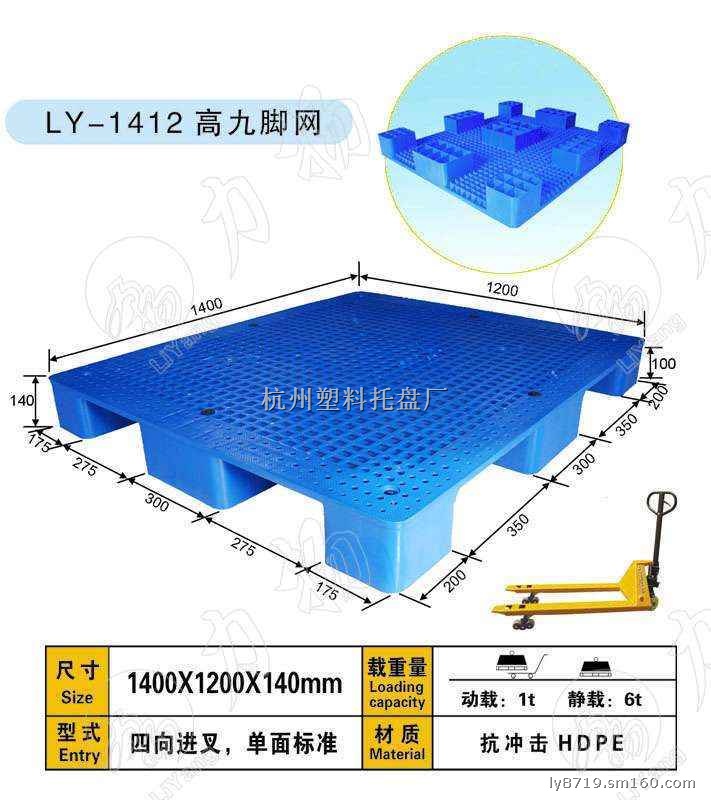 力扬塑料托盘厂采用高强度EPS30R原材料生产的各种规格塑料托盘、仓储垫板,整体承载性好、抗冲击性强、耐温性好。同时开发出啤酒饮料自动流水线专用托盘和仓储物流专用货架托盘主要规格型号:1400*1200*150 1400*1100*150 1300*1100*150 1200*1200*150 1200*1000*150 1100*1100*150 1200*800*160 1400*1200*140 843*435*63 540*345*55 1125*700*150 1200*1000*140 1200*1100*140 1200*1200*140 1000*800*160 1200*1100*150(MM)等双面、单面、川字底、九脚底等规格系列托盘及垫仓板。我公司生产的塑料托盘以广泛应用于食品、医药、化工、啤酒饮料、服装、电子等各企事业单位的生产与仓储过程。节省了人力物力,缩短了物流周转时间提高了工作效率