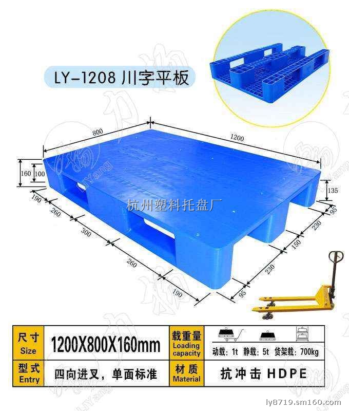 力扬塑料托盘厂采用高强度EPS30R原材料生产的各种规格塑料托盘、仓储垫板,整体承载性好、抗冲击性强、耐温性好。同时开发出啤酒饮料自动流水线专用托盘和仓储物流专用货架托盘主要规格型号:1400*1200*150 1400*1100*150 1300*1100*150 1200*1200*150 1200*1000*150 1100*1100*150 1200*800*160 1400*1200*140 843*435*63 540*345*55 1125*700*150 1200*1000*140 1200*1100*140 1200*1200*140 1000*800*160 1200*1100*150(MM)等双面、单面、川字底、九脚底等规格系列托盘及垫仓板。我公司生产的塑料托盘以广泛应用于食品、医药、化工、啤酒饮料、服装、电子等各企事业单位的生产与仓储过程。节省了人力物力,缩短了物流周转时间提高了工作效率
