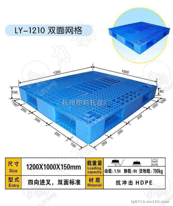 力扬塑料托盘厂采用高强度EPS30R原材料生产的各种规格塑料托盘、仓储垫板,整体承载性好、抗冲击性强、耐温性好。同时开发出啤酒饮料自动流水线专用托盘和仓储物流专用货架托盘主要规格型号:1400*1200*150 1400*1100*150 1300*1100*150 1200*1200*150 1200*1000*150 1100*1100*150 1200*800*160 1400*1200*140 843*435*63 540*345*55 1125*700*150 1200*1000*140 1200*1100*140 1200*1200*140 1000*800*160 1200*1100*150(MM)等双面、单面、川字底、九脚底等规格系列托盘及垫仓板。我公司生产的塑料托盘以广泛应用于食品、医药、化工、啤酒饮料、服装、电子等各企事业单位的生产与仓储过程。节省了人力物力,缩短了物流周转时间提高了工作效率