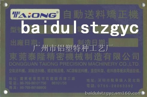 本厂专业生产各种铝、铜、锌合金、不锈钢金属标牌、铭牌. ◆业务范围包括:◆各类金属面板/铝面板/铝拉丝氧化面板 ◆铝面板 ◆铝合金拉丝标牌 ◆铝标牌 ◆金属丝印,金属蚀刻◆金属高光标牌◆五金铭牌 ◆各类金属标贴 ◆铝质铭牌 ◆机械铭牌 ◆机器标牌 ◆高光标牌 ◆家电铭牌◆机电铝标牌 ◆各类金属/铝质标牌/铝合金标牌◆ 本厂具有专业的标牌设计及生产,具有丰富的工业经验,包括金属的标牌的报价及熟练的工艺介绍,做出客户所期望的完美标牌,标牌设计与生产周期短,将各类金属标牌,与来料加工技术融为一体设计生产,可用不同厚度的金属材料生产出不同效果的产品,可开发不同形状的模具,生产外形各异的金属铝质标牌,外观精美,立体感强,使用方便快捷等,同时得到了老客户的大力持支与厚受,希望我们高效生产及精美高档的金属标牌,能给我们的广大客户,在工作中带来,意想不到的收获,欢迎广大客户来电下单,咨询【厂家优势】㊣、丰富的生产经验 ㊣、先进的生产设备,㊣ 优质的产品质量,㊣合理的优惠定价㊣灵活的经营机制,㊣完善的售后服务
