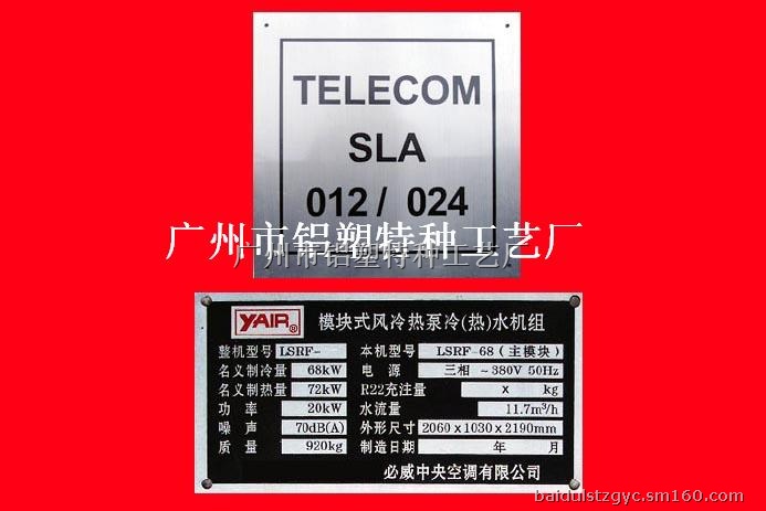 本厂专业生产各种铝、铜、锌合金、不锈钢金属标牌、铭牌;夜光、反光标牌;三维立体标牌;高光拉丝标牌,五金铭牌;电铸标牌;机电铭牌;标志铭牌;产品铭牌;PVC标牌、铭牌;水晶滴胶铭牌,镜面,魔镜,亚光面、拉丝面等各类面板铝标牌、铭牌等,制作工艺有,印刷,冲压,压铸,烂版,氧化、镐光、磨光、抛光、电镀、喷漆、喷砂、拉丝、过油处理等。 产品广泛适用于各类家电、音响、电脑、仪器仪表、电子设备、各类机械、通讯设备、运动器材、模型、高档玩具、家私等产品【厂家优势】㊣、丰富的生产经验 ㊣、先进的生产设备,㊣ 优质的产品质量,㊣合理的优惠定价㊣灵活的经营机制,㊣完善的售后服务【特别申明】单价需根据客户的数量、规格、印刷颜色的定制要求计算,