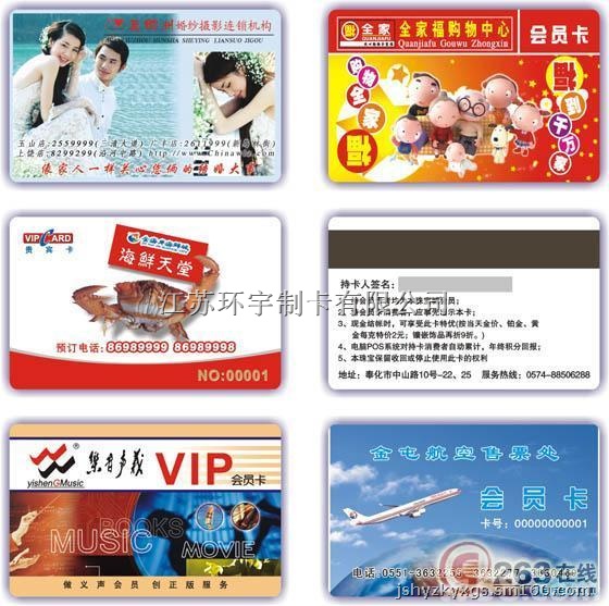 江苏环宇制卡,主要制作PVC卡和智能卡,卡片的制作种类有:接触式IC卡、非接触式IC卡、ID卡、人像卡、贵宾卡、会员卡、磁条卡、条码卡、射频卡、体温卡、学生证、校园卡、服装吊牌卡、异形卡、刮刮卡、医疗卡、保险卡、年历卡、上网游戏卡、金属卡、金卡、银卡、铂金卡、酒店预订卡、企业广告卡、感应IC卡、感应ID卡、透明卡、磨砂卡、半透明磨砂卡、钻石卡、水晶卡、医保智能卡等各类PVC塑胶卡片、工作卡、刮刮卡、积分卡、考勤卡等。本司采用四色印刷,具有印刷精度高、色彩鲜艳、出货快的特点,同时改进了传统的制卡工艺,有效地避免了偏色、卡面刮花等等制卡常见质量问题。质量过硬、价格适中是本司的最大优势。