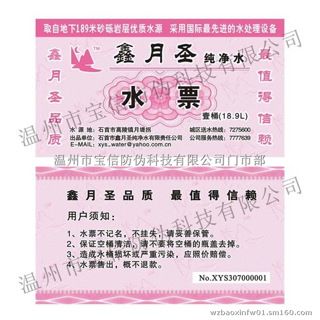 温州宝信防伪公司荣获《国家防伪技术产品生产许可证》是电子监管码标签定点生产企业。专业制作防伪票据、防伪水票、防伪门票、水票防伪印刷、游乐园门票、公园门票、开水票、学生饭票、大型演唱会门票、不干胶水票、有价值防伪票据、印刷水票、纤维纸防伪票据、旅游景点防伪门票、演唱会防伪门票、展会防伪门票、大型演唱会门票 水票防伪印刷 滴水消失防伪门票电影院防伪门票电子防伪门票、上海防伪门票、温州防伪门票、防伪门票卡、安全线防伪门票和防伪门票、金融业防伪票据、航空业防伪票据、娱乐消费防伪票据、税务防伪票据、代金防伪票据和防伪票据设计。欢迎各界朋友来电洽谈,防伪热线:0577-64200298,13758885442 QQ:289894015 公司网站:www.baoxin.cn www.wzbaoxin.com 联系人:胡群杰