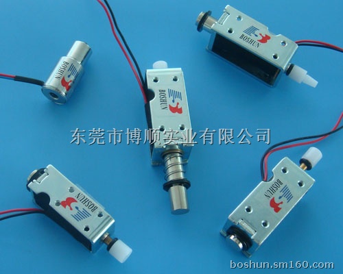 东莞市博顺实业有限公司电磁铁、电磁吸铁、螺线管、电磁铁线圈、电磁阀、水阀、气阀、泄气阀、排气阀、电控锁、按摩椅电捶、valve、 coil、solenoid-valve 、solenoids、Electro-magnet广泛运用于自动控制设备:办公设备(打卡钟、复印机、传真机、扫描仪、装订机、美工切纸机、计算机机箱控制锁、喷码机、喷墨机)、金融设备(收款机、点钞机、验钞机,换钞机、贩卖机投币器、收银机、钱箱);各种电子自动门锁((防盗门锁系列)、商场储物寄存柜、门禁机、电子门锁,储物柜、消防器材、安防器材、密码锁、保险柜);消费机,售饭机,读卡机、自动售货机,投币电话机、大米分选机、LED显示屏、自动气路控制,自动水路控制、巡更机、各自动机械(纺织机、绣花机、毛织机、绣花机、邦定机);家用电器(咖啡机、饮水机、电压力锅、电饭煲、烤面包机、空调、洗衣机、冰箱,洗碗机);健身器材(按摩椅、按摩垫、按摩床、美容设备、按摩锤、足底按摩器、美腿机、气垫床、娇正器)、医疗设备(血压计、牙科整牙机、脉搏器、血液透晰仪)、通讯设备、电子电机零件、各类游戏机(玩具、弹珠台、挖糖机、跳跳球、娃娃机、蜘蛛王、投币机、打老鼠、打地鼠、青蛙王子);汽车零件(汽车车灯、汽车电源转换器、汽车排气箱、汽车换檔器、汽车按摩椅电磁阀、安全皮带锁、汽车氙气大灯、汽车伸缩灯、汽车后背箱锁)……等等控制设备。