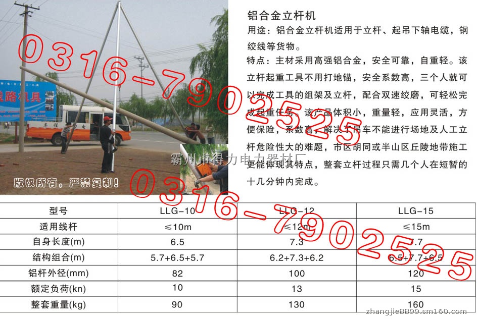 如果您为线路施工组立线杆费时费力而苦恼,请选用我厂生产的立杆机,本厂生产的铝合金立杆机采用国标铝合金型材制作而成,立杆机具有重量轻,负荷大,操作简便的有点,是您电力施工中的好帮手。