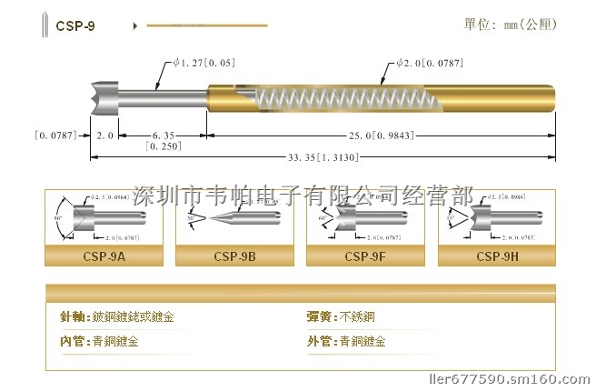 针轴:铍铜或碳工具钢镀金。内管:磷青铜镀金。弹簧:琴钢线镀金外管:磷青铜镀金。