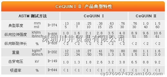 CeQUIN II是两层的CeQUIN I的覆合产品,从而具有更好的机械性能和绝缘性能,厚度有从30mil(0.76mm)到60mil(1.52mm), 作为更厚的卷材,可用于间隔绝缘,轴芯绝缘。