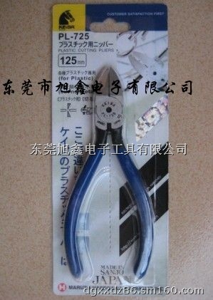 品名型号:马牌PL-725/PL-726水口钳 生产地区:日本国 剪口类型:平面斜嘴 材料质量: 硬质合金 剪切能力:用于剪切塑料水口类,少用于铁丝和钢丝等金属 规格大小:5寸/6寸 手柄类型:蓝色光滑柄 包装规格: 6把/盒