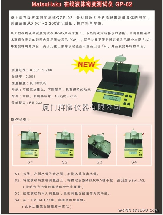 桌上型在线液体密度测试仪GP-02,是利用浮力法的原理来测量液体的密度,测量范围从0.001~2.200皆可测量,操作简单方便。
