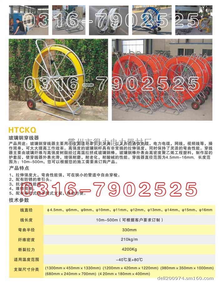 电缆穿孔器主要由玻璃纤维与高强度树脂经过高温拉挤成玻璃纤维线。这种线具有很高的抗拉强度并有良好的柔韧性,玻璃纤维线外表由高密度聚乙烯工程塑料制作层的护套层,使穿孔器外表光滑、耐磨,耐老化,耐酸碱、具有良好的的绝缘性能使他用在有电缆的管道里的时候很安全。