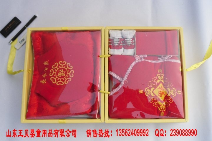 【礼盒配置】:A类婴幼儿产品,一等品,100%棉,送礼上品! 5件套组合1件上衣(后弧衫),1双袜子、1个帽子、1个亮缎枕头、1个肚兜。高档双盒包装,性价比很好的,喜庆富贵的大红色,超显贵气。冬季 款 配送礼盒手提袋