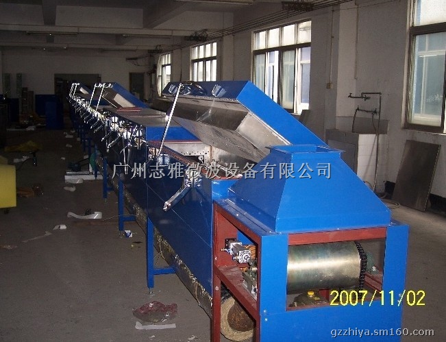 橡胶制品由胶料压成型后,必须经硫化才会有弹性、耐磨性等特征。硫化过程指在一定条件下,胶料中的生胶与硫化剂发生化学反应,使橡胶由线型结构的大分子交联转变成网状结构的大分子交联,导致胶料机械性能的明显改善。在硫化过程中,网状交联的形成要在加热的条件下才得以进行。在常规加热硫化工艺中,热量是依靠胶料的导热性由表及里传进去,由于橡胶的导热性很差,所以要使制品整体都达到硫化温度就需要很长时间,且易形成温差梯度而造成硫化不均。采用微波硫化,胶料直接吸收微波能而内外同时发热,制品整体达到硫化温度的时间很短(约为常规的几十分之一到百分之一),且表里不存在温差梯度,故硫化迅速而均匀。