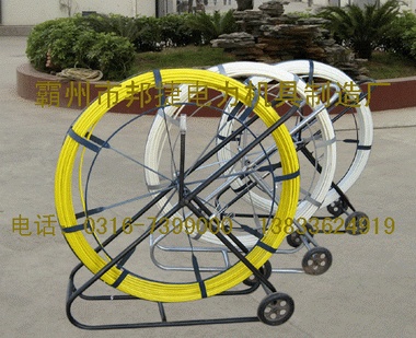 电缆穿孔器主要由玻璃纤维与高强度树脂经过高温拉挤成玻璃纤维线。这种线具有很高的抗拉强度并有良好的柔韧性,玻璃纤维线外表由高密度聚乙烯工程塑料制作层的护套层,使穿孔器外表光滑、耐磨,耐老化,耐酸碱、具有良好的的绝缘性能使他用在有电缆的管道里的时候很安全。