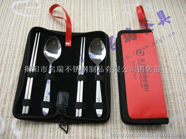 旅行餐具包,不锈钢餐具4件套。西餐刀,叉子,勺子,筷子为全不锈钢材质,可用塑料柄的,可以选择其它餐具组成套装,也可将4件套改为全不锈钢叉勺筷子6件套,全凭客户意向。