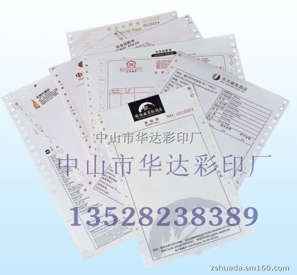 中山市华达彩印厂专业生产针式打印机专用1-8层,1-6个印刷颜色,可连续打印,自动复写,多种规格两边带孔电脑打印纸、各式电脑表格票据、物流货运单、快递单、印刷电脑打印纸、各式保密信封、保密工资单、牛皮菲仔纸及电脑打印不干胶贴纸等。各类彩印(吊牌、宣传单张、说明书等)、无碳纸联单表格、不干胶标签。