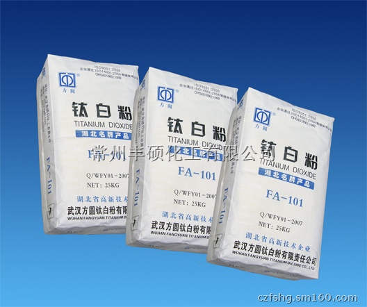 武汉方圆FA-101 锐钛型FA-101 【产品简介:】方钛牌锐钛型钛白粉FA-101 产品特点分子量为79.9,比重3.9,化学性质稳定,不溶于水,脂肪酸和弱无机酸,但能微溶于碱,能被浓硫酸及盐酸溶解,本品外观白,粒子细软,分散性能好。有很好的遮盖力,并有卓越的颜料性能。用途 FA-101钛白粉属通用级钛白粉,用途广泛,适用于室内外涂料(包括水性和溶剂性,像工业涂料、建筑涂料、装饰用漆等)、高固含量漆、粉末涂料、路标漆、船舶专用漆和油墨,同时还可在塑料(聚氯乙烯、聚乙烯、聚苯乙烯和聚氨脂等)、橡胶、造纸和皮革等行业广泛应用。产品指标项目指标 TiO2含量%(m/m) ≥98.0 经23±2 0C及相对湿度(50±5)% ≤0.5 颜色(与标样比)不低于消色力(与标样比) ≥100 1050C% ≤0.5 水溶物% ≤0.5 水悬浮液PH值 6.5-8.0 吸油量g/100g ≤26 筛余物(45um筛孔)% ≤0.10 水萃取业液电阻率 20每袋净重25kg