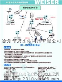 本灾害预警系统由灾害预警监视站与受警对象和监视中心组成。其中灾害预警监视点由自动(雨量、水位等)检测设备构成。由于跟水情测报设备比较价格低、小巧、可靠、安装方便、维护简单,又能满足(雨量、水位等)数据采集,便于大规模部防。受警对象通常是村、镇、县、市的管理人员,报警信息以短信方式送到相关手机上。监视中心通常可监视、管理一区域的灾害信息,它采用GPRS通讯作为管理设备运行,掌握设备工作情况。一个简单系统可不设监视中心以减少投资(或分步建设)。