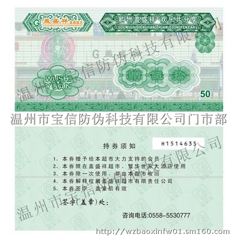 温州宝信防伪科技有限公司成立于2002年,从事防伪商标制作已经十载有余,是温州首家取得国家许可的防伪技术产品制作厂家。宝信防伪专业制作各类有价防伪证券,防伪代金券,优惠券,折扣券,商品券,商品兑换券等等各行业防伪券制作印刷,欢迎各界朋友来电洽谈: