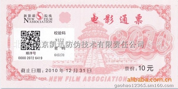 新影联防伪电影通票印刷、二维码防伪门票印刷