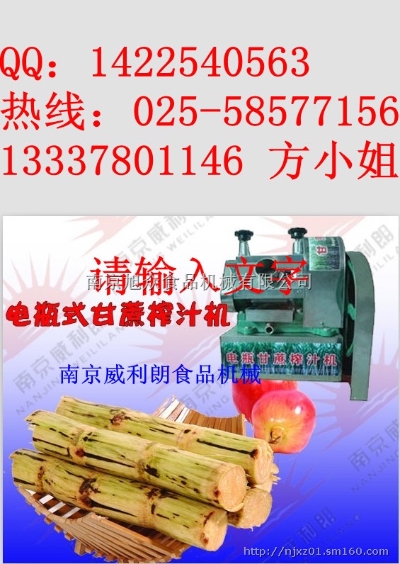 我公司专业研究生产的蓄电池甘蔗榨汁机自带电瓶蓄电池,方便流动经营,任何地点均可营业,免去手动榨甘蔗汁机的辛劳,又不受普通电动榨甘蔗机接电线的烦恼。食品接触部份采用不锈钢制造,卫生安全。 蓄电池甘蔗榨汁机采用皮带及齿轮减速传动,具有效率高,耗电省,噪音低,体积小,操作方便等特点。 电瓶甘蔗榨汁机、蓄电池甘蔗榨汁机机器内部凡接触鲜蔗的地方均采用不锈钢制造,榨甘蔗机符合卫生要求。适合于各宾馆、酒楼、饮食店、集体食堂,制作甘甜可口的绿色饮料之用。 蓄电池甘蔗榨汁机:方便流动作业,小本创业新革命!不用找店铺!不用付房租!无需装修费,不用办营业执照,销售地点随处去,车站、码头、购物中心、大型超市、商业街、餐饮小吃街,夜市、工业区、步行街、学校、农贸市场、旅游景点等。到当地城市人流量最大、最热闹的地方,人越多的地方生意越好。让你统治闹市,雄霸街头,轻松实现创业梦。淘到人生第一桶金。 电瓶榨甘蔗机使用注意事项 1、削根、削头、刨皮可压榨。此机功率450W 电源是24V/20A