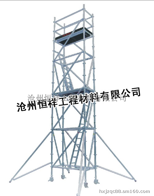 移动脚手架,高1.7米,宽0.95米,长1.8米。另一种是高1米,宽0.95米,长1.8米, 其它型号都可以订做,以上两种型号分梯型和门型。移动脚手架有如下特点: