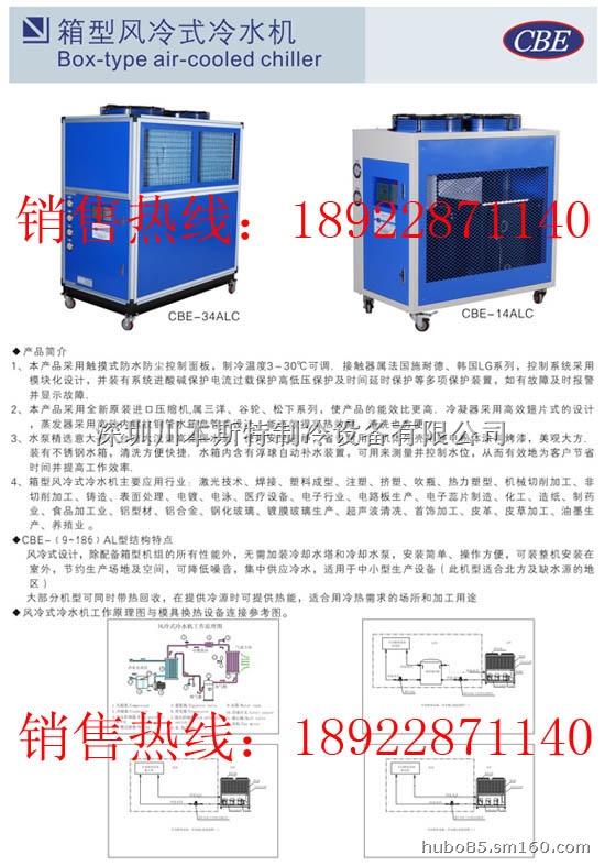 4、 箱型风冷式冷水机主要应用行业:激光技术、焊接、塑料成型、注塑、挤塑、吹瓶、热力塑型、机械切削加工、非切削加工、铸造、表面处理、电镀、电泳、医疗设备、电子行业、电路板生产、电子蕊片制造、化工、造纸、制药业、食品加工业、铝型材、铝合金、钢化玻璃、镀膜玻璃生产、超声波清冼、皮革、皮草加工、油墨生产、养殖业。